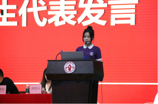 接着,由優秀學生代表林卓琪同學發表獲獎感言。林卓琪結合自身一年來的學習經驗與成長故事,用真切又生動的話語分享了自己在學業探索中的心得感悟。她向全體同學發出倡議:在即将到來的考試中要堅守誠信底線、端正考風考紀,以真實的成績檢驗學習成果。